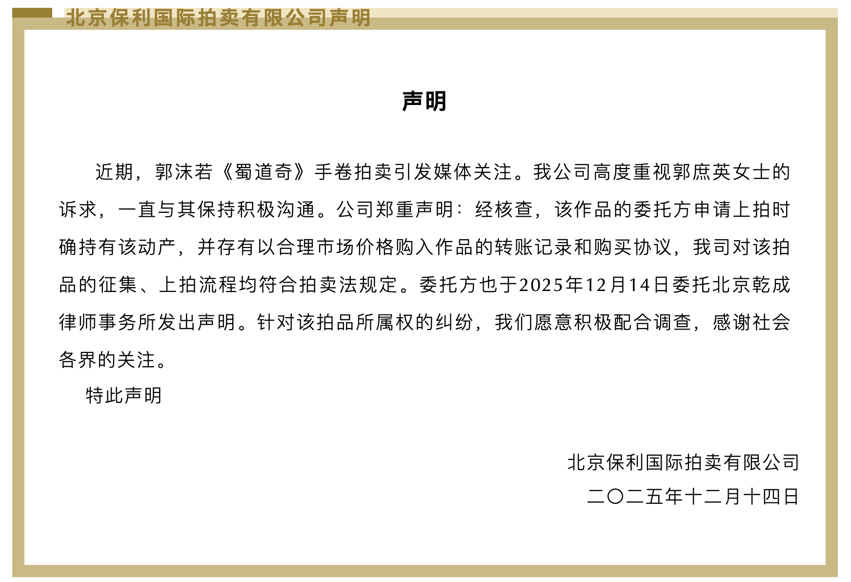 声明称,委托方也于12月14日委托北京乾成律师事务所发出声明。针对该拍品所属权的纠纷,我们愿意积极配合调查。
